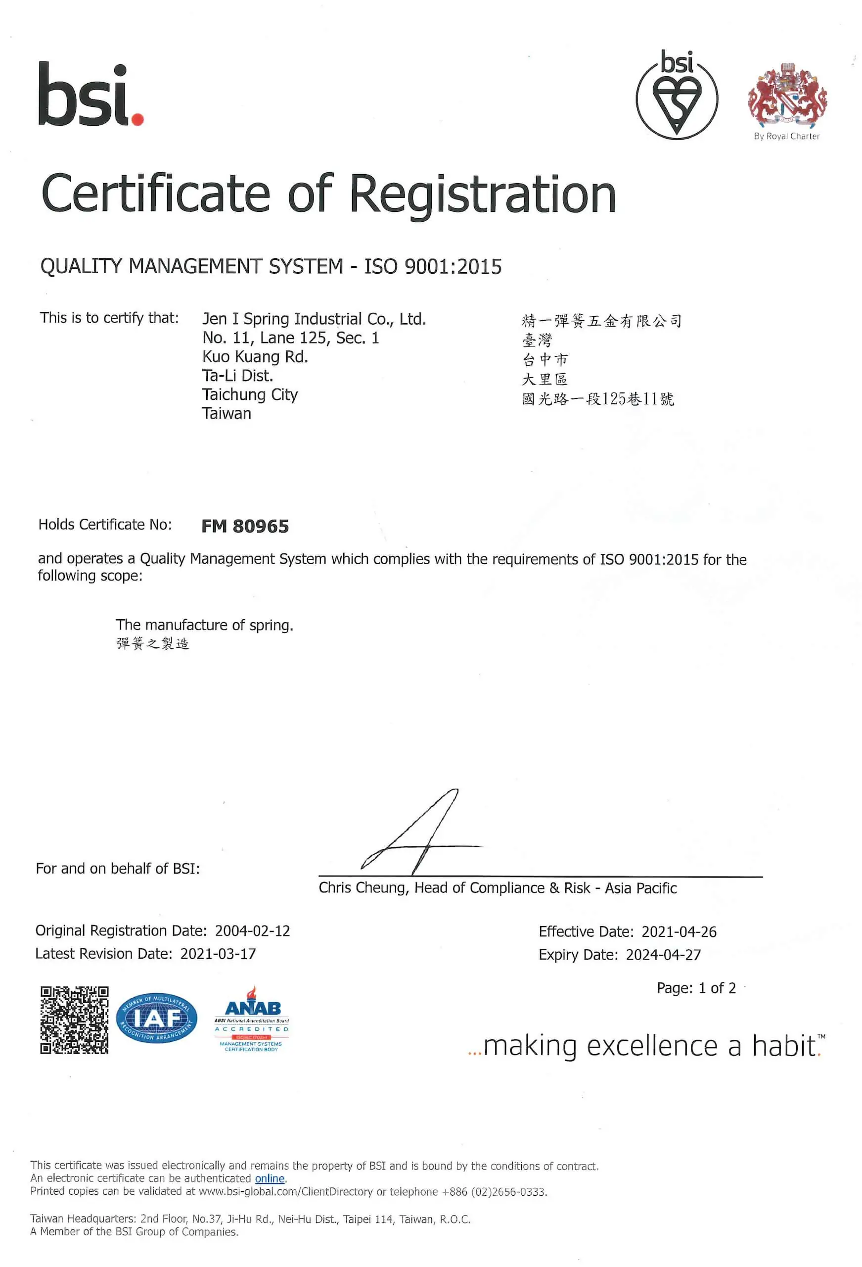 精一彈簧於 2003 年通過 ISO:9001 品質管理系統,導入至今已超過 20 年,經過多次改版,已轉版至最新的 ISO:9001:2015 年版。品質不單單是個名詞,而是精一全體遵循的最高行為原則。